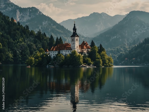 © claudunia, Fototapeta premium Lake Bled in the mountains during the day.