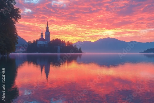 © EdvvinStudios, Fototapeta premium Lake bled island reflecting stunning red sunrise in slovenia