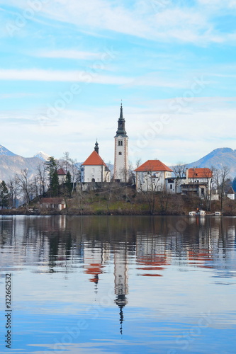 Fototapeta premium Lake Bled Slovenia. Beautiful mountain lake with small Pilgrimage Church....