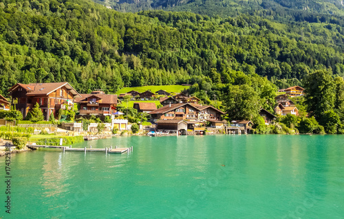 Fototapeta premium Lake Brienz (Brienzersee) Embankment Scenery view from cruise boat, Interlaken, Switzerland, Europe
