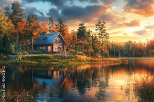 © Goncharenko, Fototapeta premium Lake cabin