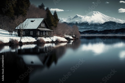 © E , Fototapeta premium lake cabin in the snow with white mountains in the distance, generative ai composite