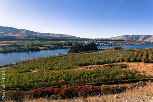 Naklejka premium Lake Chelan plant fields in a beautiful autumn day. Chelan, Washington