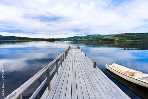 Obraz premium Lake dock with boats on a summer afternoon in Norway. The water was calm...