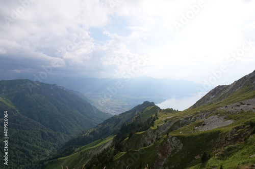 Fototapeta premium Lake Geneva in Switzerland seen from a scenery mountain perspective on a...