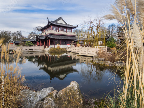 © shantihesse, Fototapeta premium lake in front of a japanese style house