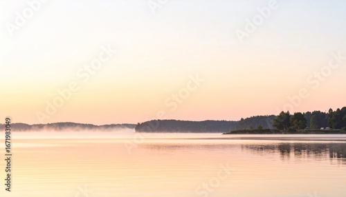 © Pure Imagination, Fototapeta premium Lake in Soft Sunrise Haze with Reflections Surrounded by Trees and a Calm Surface in Tranquil Morning