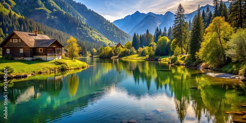 Naklejka premium Lake in the mountains with trees in the jungles, river flowing and house...
