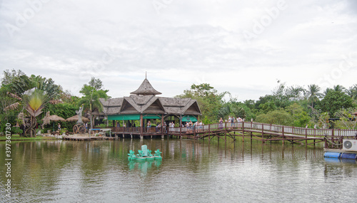 Fototapeta premium Lake in the park. Tourists drink tea and look at fish in the water