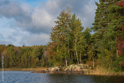 © Ula Ulachka, Naklejka premium Lake Ladoga near the village Lumivaara on a sunny autumn day, Ladoga skerries, Lakhdenpokhya, Republic of Karelia, Russia