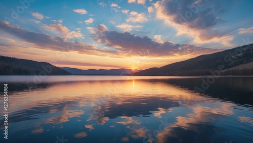 © The 2R Artificiality, Fototapeta premium Lake landscape at sunset with colorful sky and mountain reflections on tranquil water surface in autumn scenery