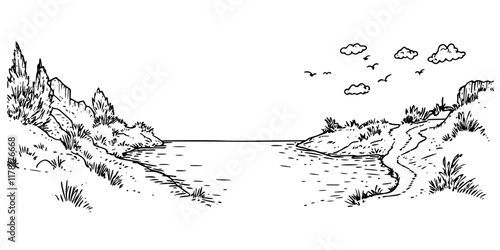Fototapeta premium lake landscape illustration with trees, path, and hills in vintage sketch style