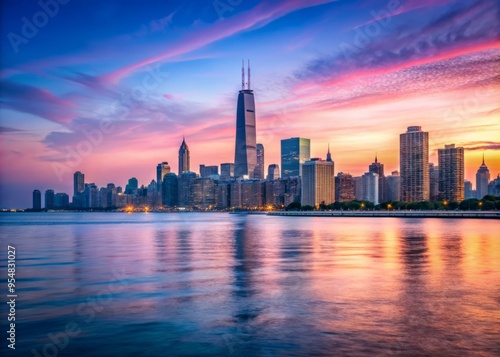 © Arethaawykoff, Fototapeta premium Lake Michigan in the evening with the Chicago skyline silhouetted against a soft pink and blue backdrop