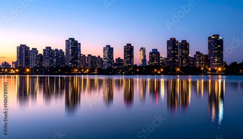 © zerogami, Fototapeta premium Lake Michigan Skyline Reflection at Dusk: A Serene Chicago Evening