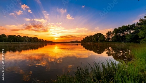 © PandaUniverse, Obraz premium lake reflecting a stunning sunset