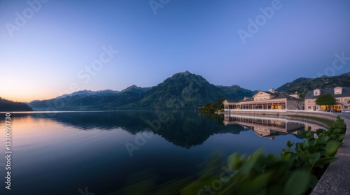 © De, Fototapeta premium Lake Reflections at Dusk with Building and Mountain Scenery View