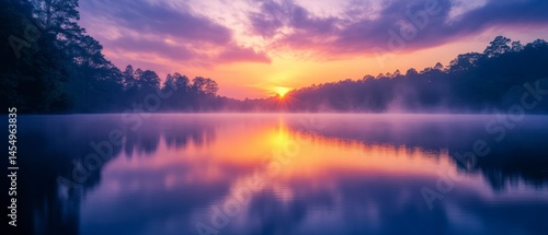 © Qbertstudio, Obraz premium Lake reflects soft hues of sunrise as fog rises from water surrounded by dark silhouettes of forest, creating serene ambiance.