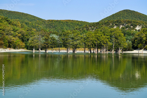 Fototapeta premium Lake Sukko, Krasnodar territory, Russia. Cypress grove in the waters of the lake. A fantastically beautiful lake in the mountains.