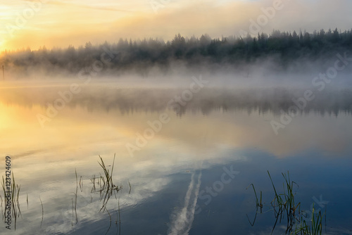 © Iri_sha, Fototapeta premium lake sunrise fog sun mist