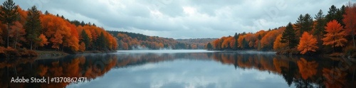 © ทุติยาภรณ์ หงษา, Fototapeta premium Lake surrounded by fiery autumn forest, overcast Estonian sky , clouds, bird's eye view