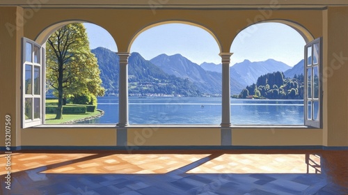 Fototapeta premium Lake View Through Arched Windows with Open Shutters