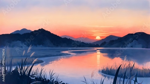© yue, Fototapeta premium lake, water, sunset, landscape, sky, reflection, clouds, sunrise, nature