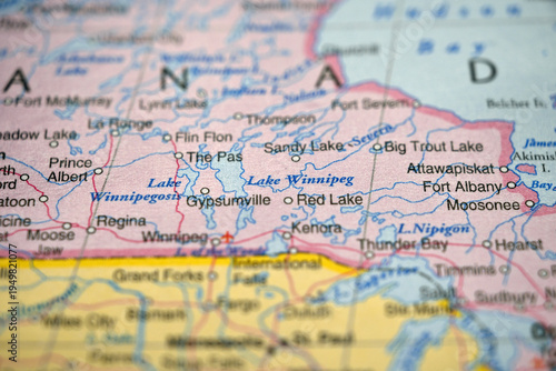 © BlueMistFilmStudios, Naklejka premium Lake Winnipeg Manitoba Canada on World Map with Defocused Background Geography Concept