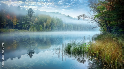 © t a k a h i r o, Fototapeta premium lake with beautiful views of large trees and mist