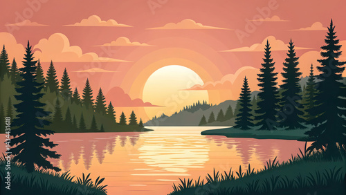 Fototapeta premium Lake with golden sun setting behind pine forest – vector art