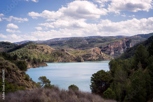 © Saturnalia, Fototapeta premium lake with green water between mountains