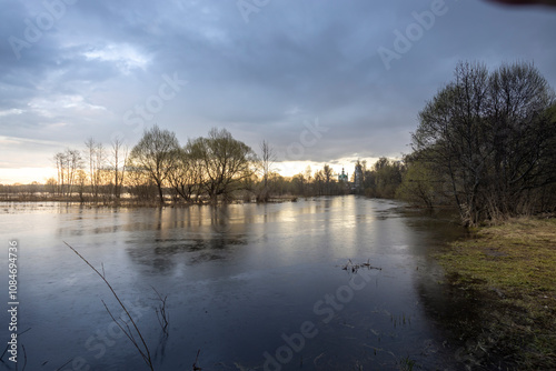 © Sergei, Fototapeta premium Lake with trees in the background and a cloudy sky