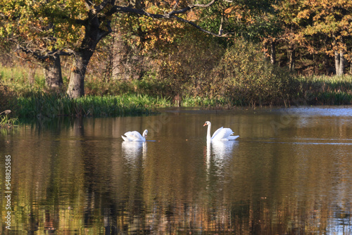 Fototapeta premium Lake with trees on the shore with yellowed foliage and two swans in autumn in sunny weather.