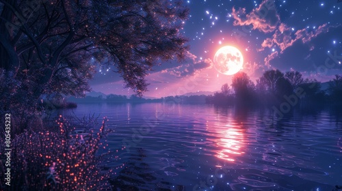 Obraz premium Lakes and Rivers Moonlight: A neon photo capturing the magical beauty of lakes or rivers under the moonlight