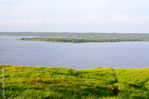 Fototapeta premium lakeshore on the sunset with green grass and blue water and horizon, copy space