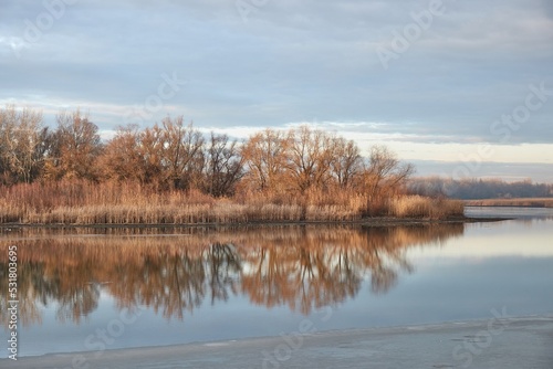 © Gudellaphoto, Fototapeta premium Lakeside autumn landscape with leafless trees