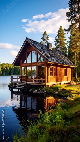 Obraz premium Lakeside cabin at dawn