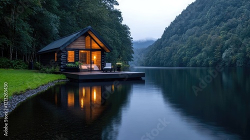 © Giman, Fototapeta premium Lakeside cabin at dusk, nestled in forest, calm water reflects lights. Ideal for travel brochures