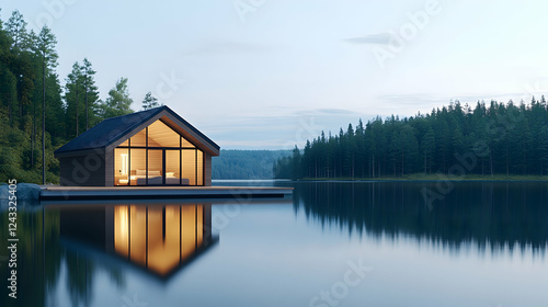 Fototapeta premium Lakeside cabin at dusk, tranquil forest backdrop, interior lighting visible,...
