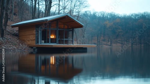 Fototapeta premium Lakeside cabin, autumn woods, firelit interior, peaceful retreat