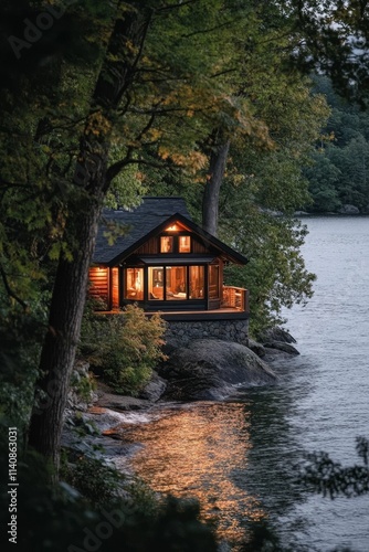 © jambulart, Fototapeta premium Lakeside cabin glows, nestled in wooded waterfront.