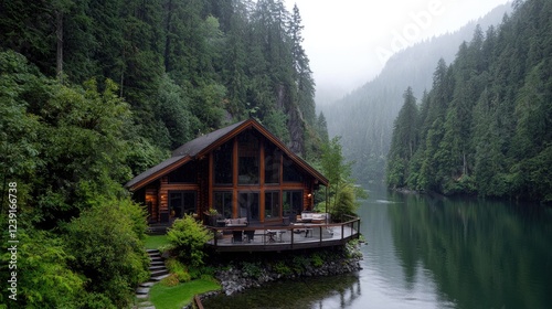 Fototapeta premium Lakeside cabin in misty forest, rainy day