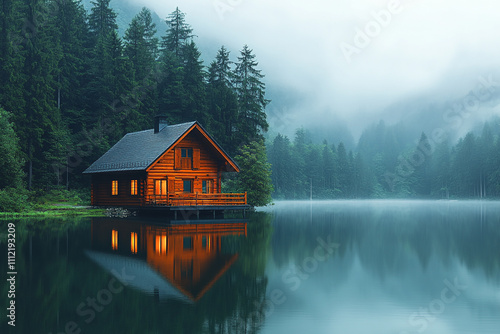 © Johanddss, Fototapeta premium Lakeside Cabin Nestled Amongst Misty Forest Trees