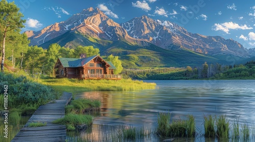 © July Wonkaa, Fototapeta premium Lakeside cabin nestled in a mountain valley at sunrise.