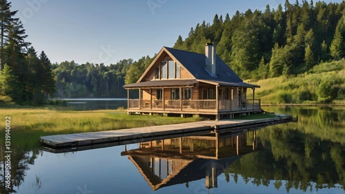 © Supath, Fototapeta premium Lakeside Cabin Reflection