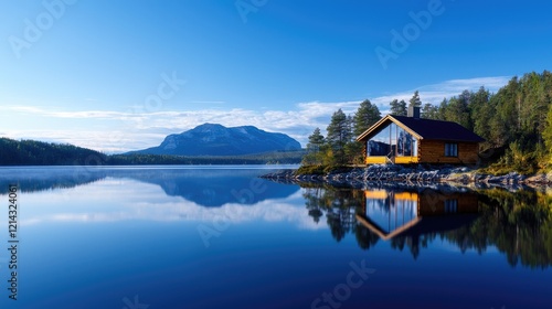 Naklejka premium Lakeside cabin reflection, mountain view, tranquil scene, nature escape