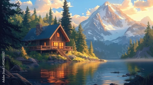 Fototapeta premium Lakeside Cabin Surrounded by Forest and Mountains in Pastel Sunset Colors
