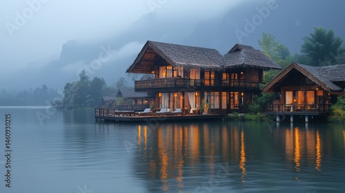 © iam, Fototapeta premium Lakeside cabins illuminated by soft evening light.