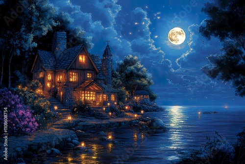 © Yuliana, Fototapeta premium Lakeside Cottage Illuminates Under A Full Moon