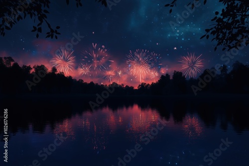 © Thomas, Fototapeta premium Lakeside Fireworks Show Under Starry Sky