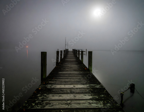 Obraz premium Lakeside Jetty With Fog And Lantern Reflections